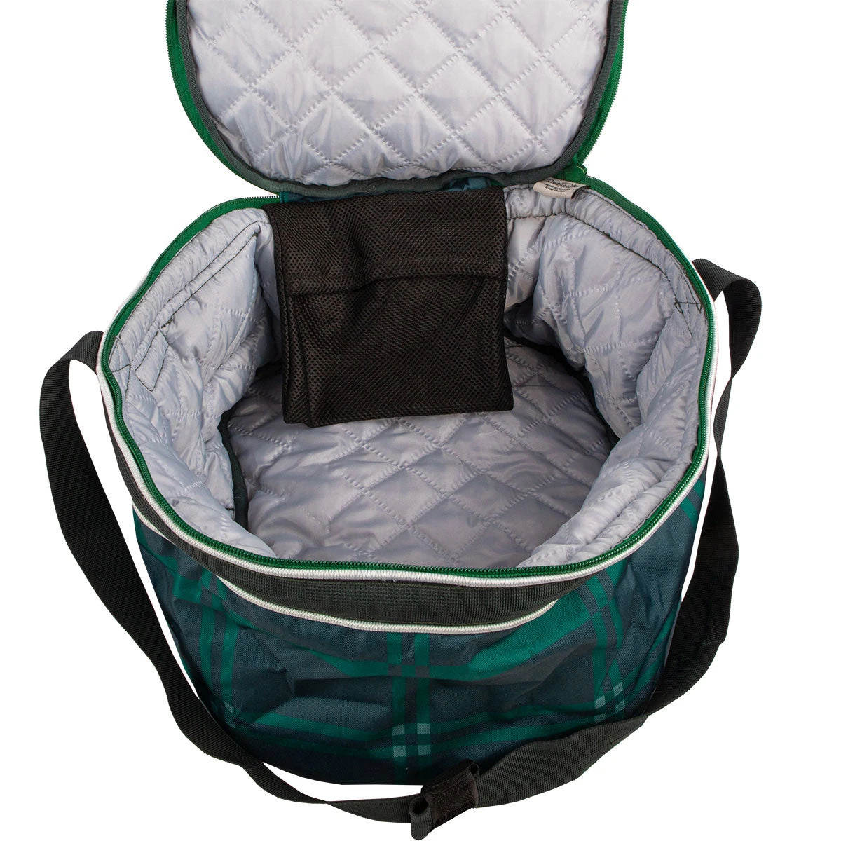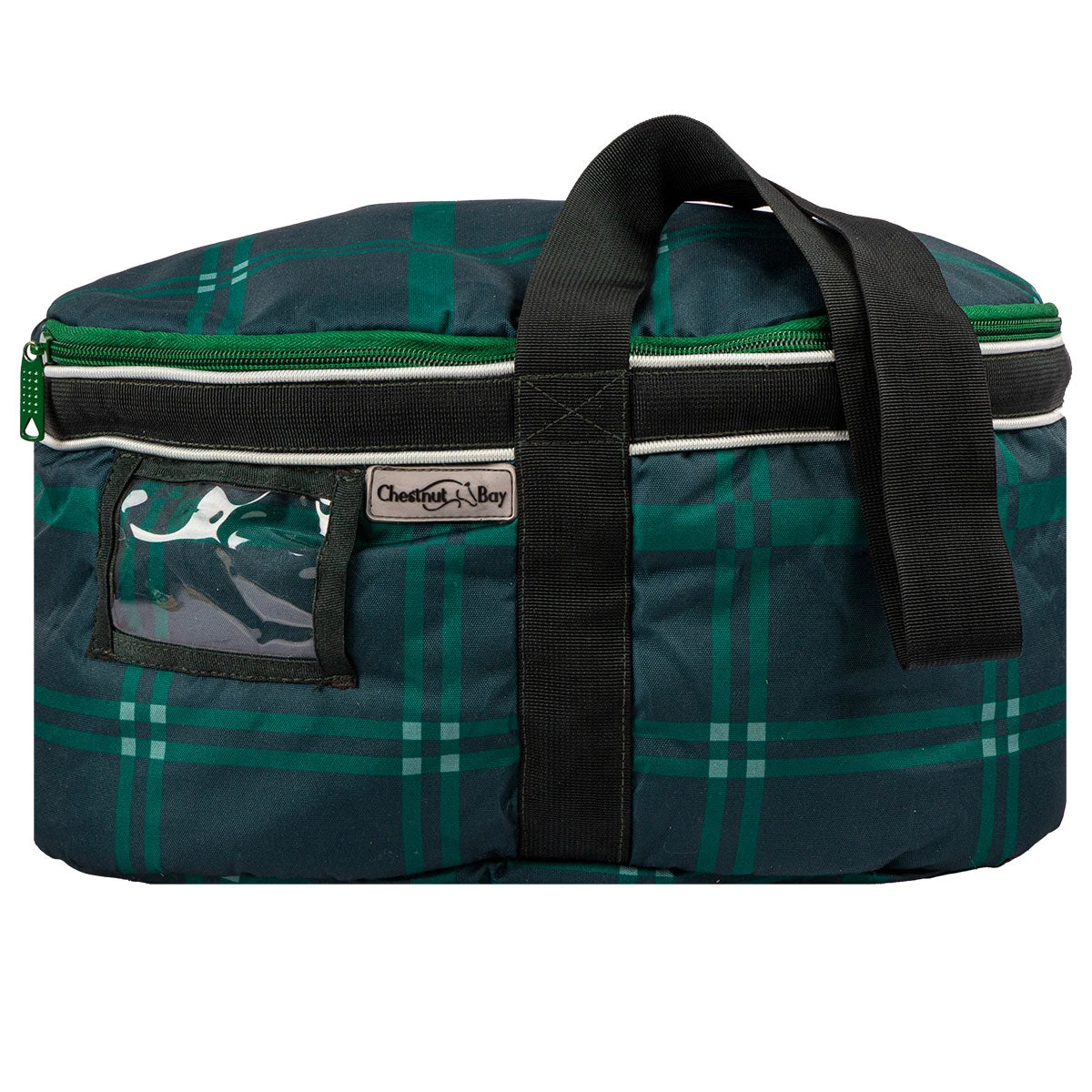Chestnut Bay Quilted Lined Helmet Bag- Hunter Plaid is fully quilted and lined, a practical and stylish way to protect and store your store helmet keeping it free from scratches, dust and water. Features a smart ID tag window so you always know this bag is yours, a handy inside mesh pocket provides extra storage for hairnets, stock pins or gloves. Lightweight carry strap makes transport comfortable and a full zipper top lid opens for wide, easy access.