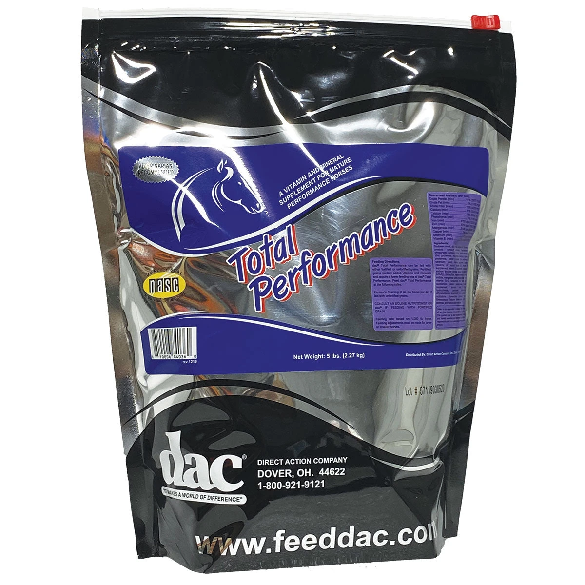 Total Performance Powder by dac provides a balanced vitamin and mineral blend for performance horses. Great total supplement that supports numerous functions including nerve, immune, hoof and coat health, and energy balance.