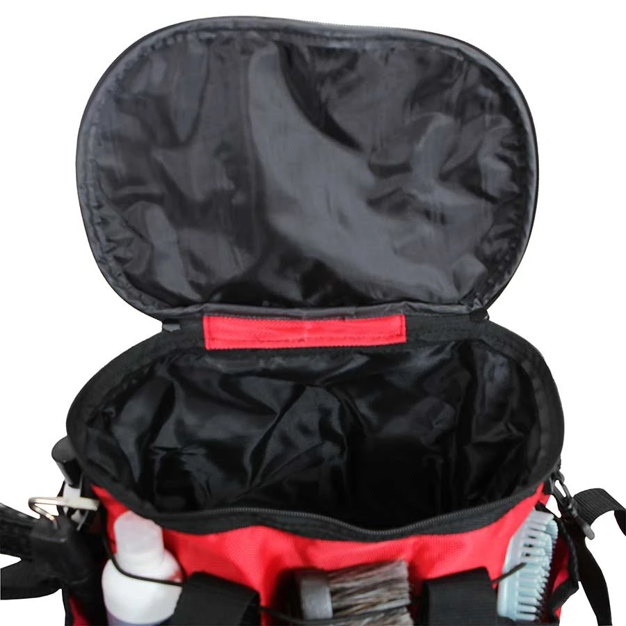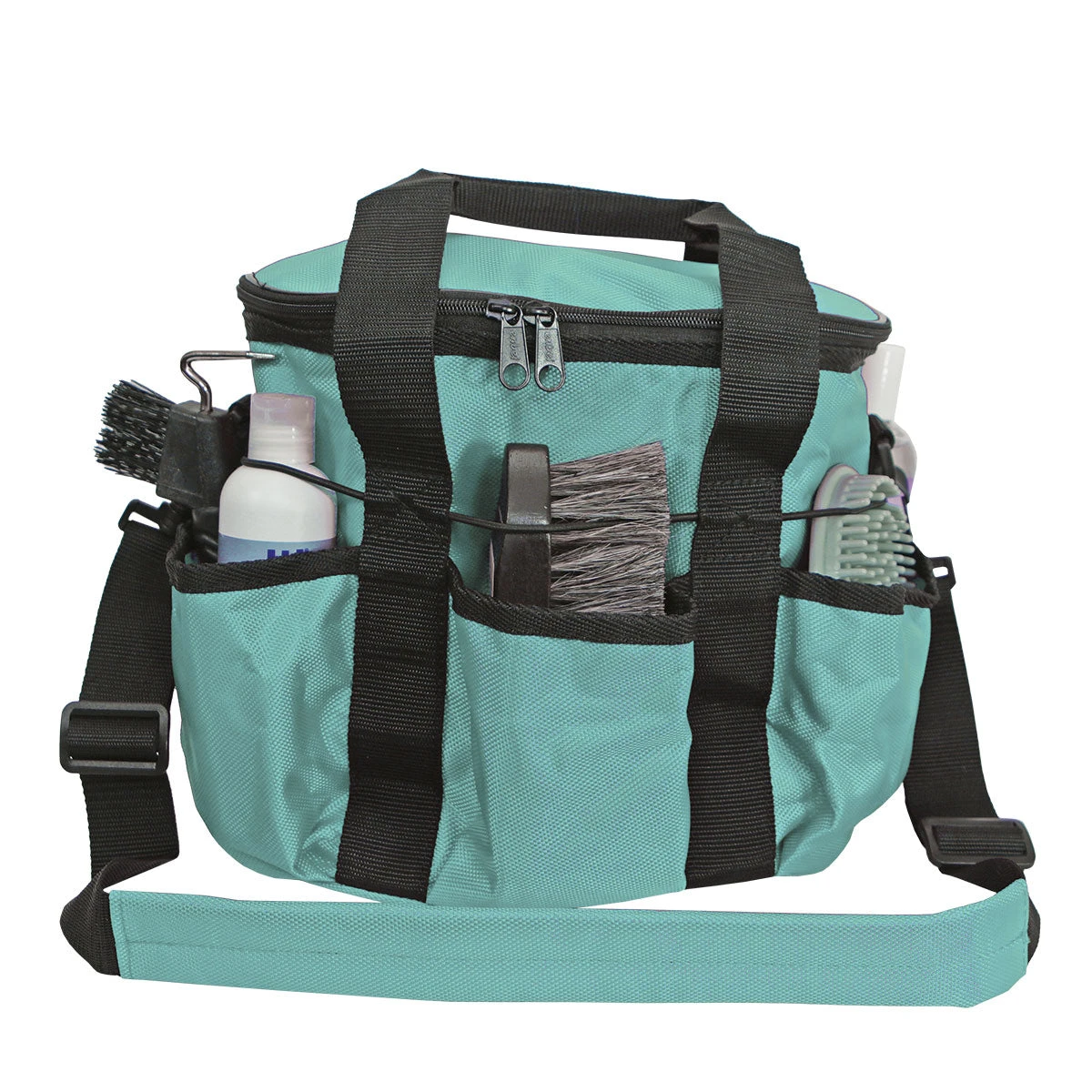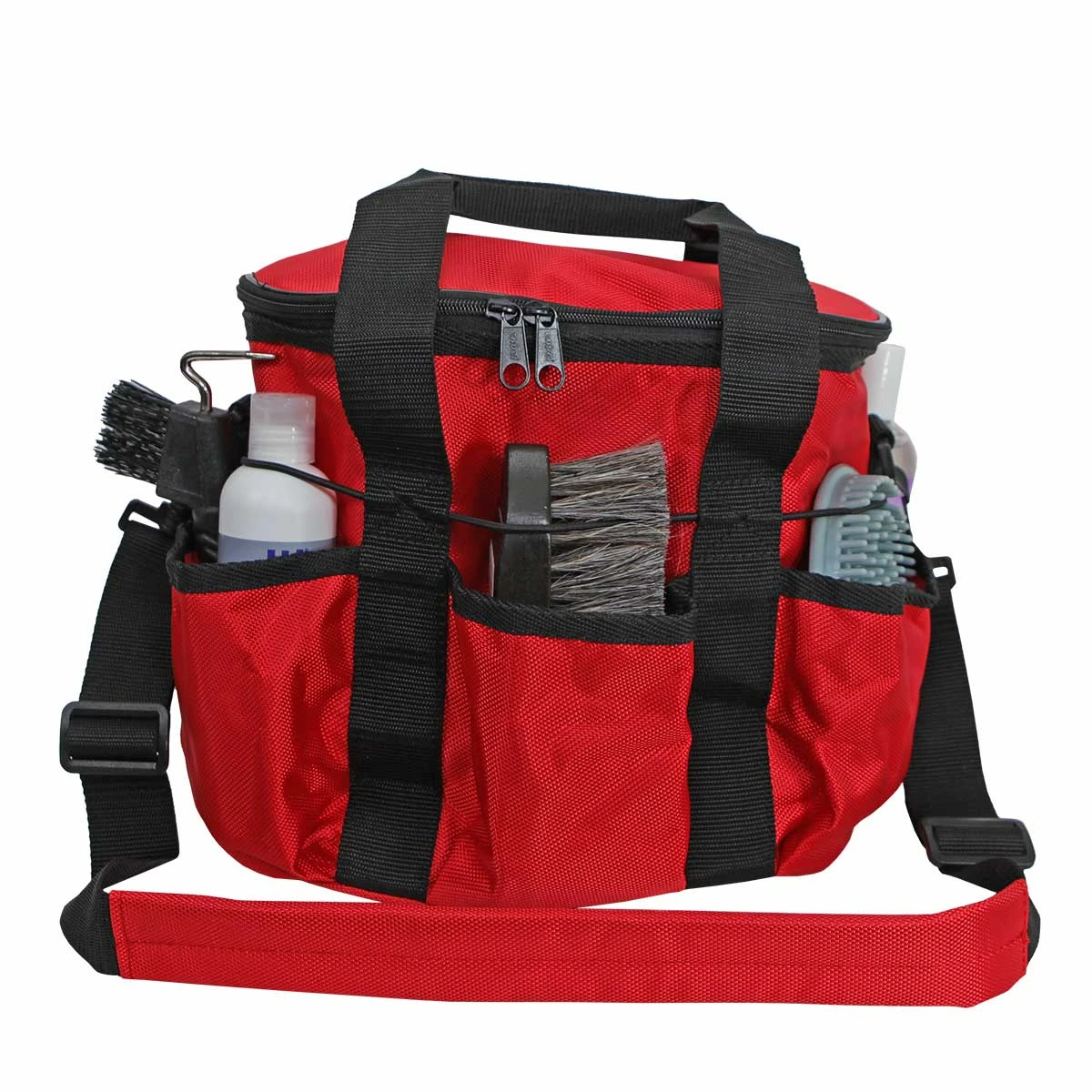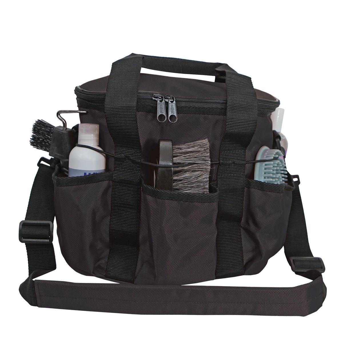 Grooming tote bag with a zipper lid is great for traveling, in the trailer or just to have in the barn. Outside pockets for storing items that you need at the ready. Convenient shoulder length carrying strap, that also comes off. Customize this tote bag with your own small logo or monogram on the top (additional charge). Brushes sold separately.