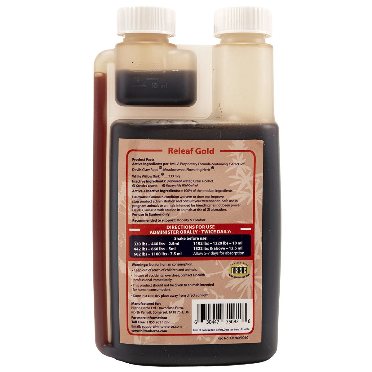 Releaf Gold from Hilton Herbs provides comprehensive support to improve mobility and comfort of joints, muscles, and connective tissue. Powerful herbal combination of while willow bark, devils claw root, and meadowsweet reduces pain and inflammation naturally. Relieves discomfort and regulates proper circulation. Beneficial for a wide variety of ailments such as laminitis, arthritis, or muscle soreness.