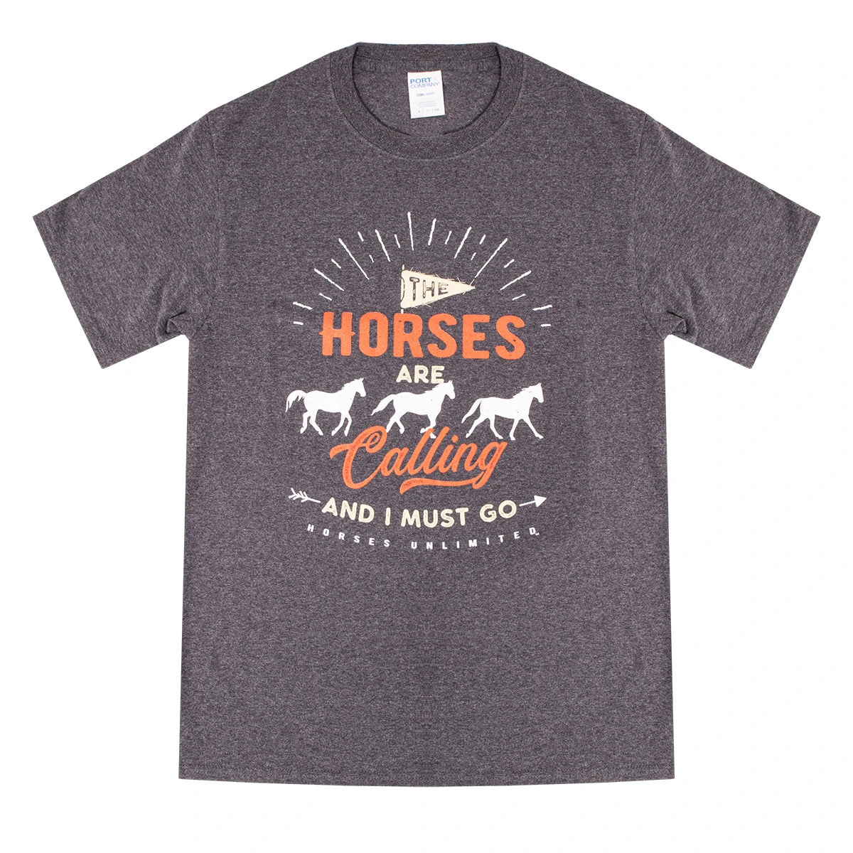 Horses Unlimited Horses are Calling Unisex Tee features a front graphic detail with three galloping horses and saying “The Horses are Calling and I must Go” a sentiment some share with the mountains, we equestrians share with our horses!